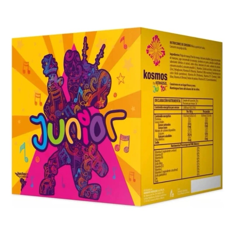 Kosmos junior complementa de forma rica y divertida los hábitos de alimentación de los niños debido a que incluye Vitaminas, Equinácea y Zinc entre otros elementos, sus ingredientes contribuyen al crecimiento de los tejidos y a la mejor utilización de nutrientes para obtener energía.