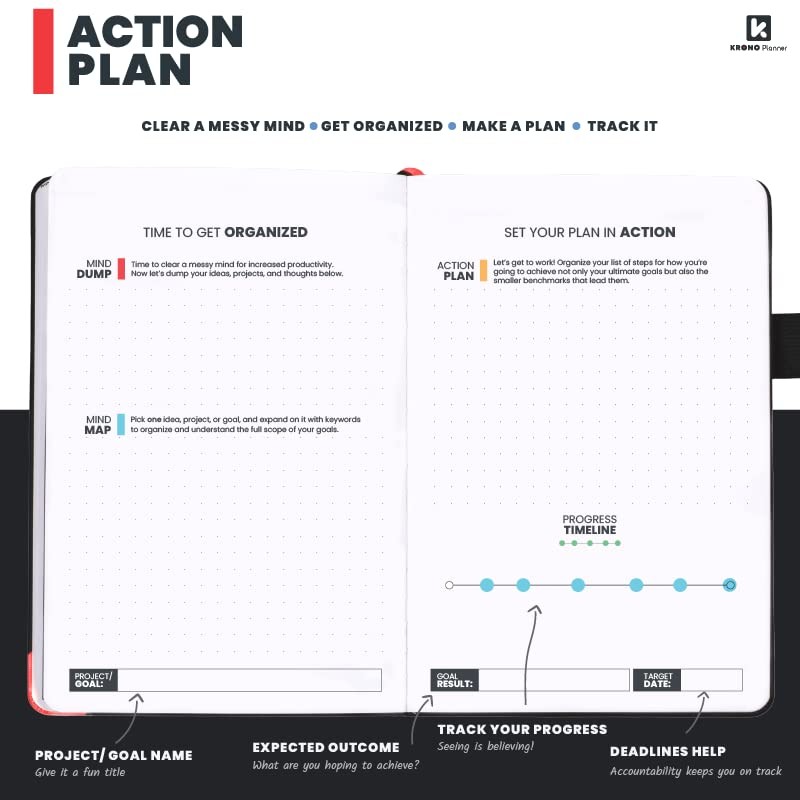 - ✅ STAY FOCUSED & PRODUCTIVE – You’re inspired! You have some great ideas but you do not know how to turn them into reality. Now you can, courtesy of KRONO’s built-in three-step planning process. Engage in the creative process by getting all your thoughts out on paper, narrow it down with a mind map, and then focus on a viable action plan.