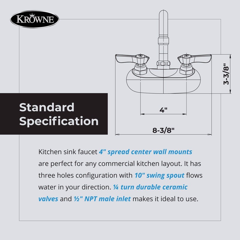 - STANDARD SPECIFICATION - kitchen sink faucet 4” spread center wall mounts are perfect for any commercial kitchen or bar. It has three holes configuration with 10” swing spout flows water in your direction. ¼ turn durable hot and cold ceramic valves and 1/2” NPT male inlet makes it ideal to use.