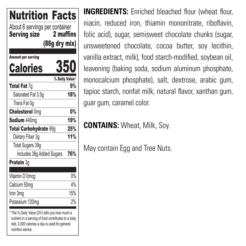- INGREDIENTS WE’RE PROUD OF: Krusteaz Chocolate Chunk Muffin Mix is made with real chocolate chunks and no artificial flavors or preservatives.