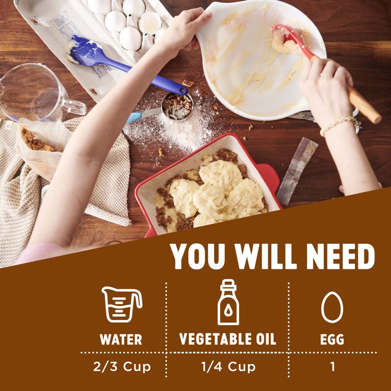 - Easy to make: Stir together cake mix, oil, water and an egg, pour into cake pan and sprinkle with cinnamon topping. Bake until a toothpick comes out clean!