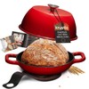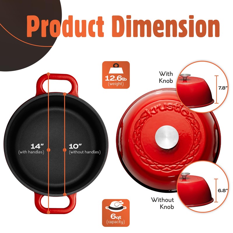 - ULTIMATE DUTCH OVEN SET: Krustic enameled cast iron Dutch oven brings a game-changing innovation to your kitchen! Measuring 14" in diameter with handles, 10" without handles, 7.8" high with the knob, and 6.8" without the knob and weighing 12.6 lbs, this 6 quart pot with lid is a perfect size to create your culinary masterpiece. Our bread oven includes a non-stick, easy-to-clean, dishwasher-safe silicone mat sized 21.4" x 8.2", a care manual, and a homemade recipes book.