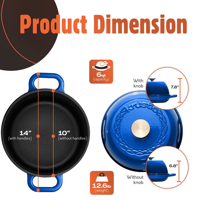 • ULTIMATE DUTCH OVEN SET: Krustic enameled cast iron Dutch oven brings a game-changing innovation to your kitchen! Measuring 14" in diameter with handles, 10" without handles, 7.8" high with the knob, and 6.8" without the knob and weighing 12.6 lbs, this 6 quart pot with lid is a perfect size to create your culinary masterpiece. Our bread oven includes a non-stick, easy-to-clean, dishwasher-safe silicone mat sized 21.4" x 8.2", a care manual, and a homemade recipes book.