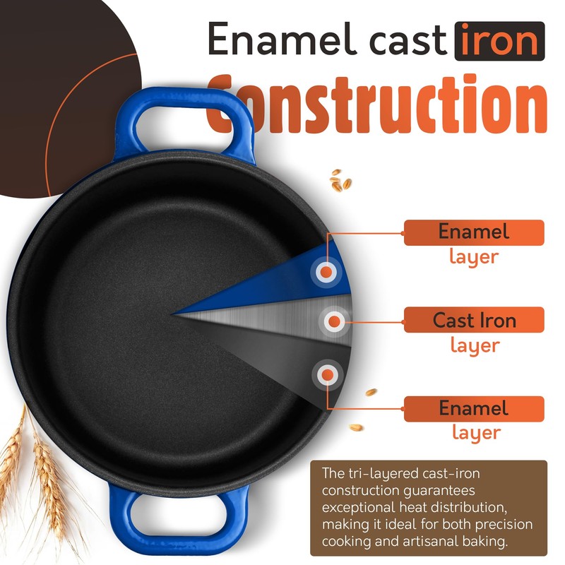 • VERSATILE 6 QT DUTCH OVEN: Enameled cast iron cookware set versatility goes beyond baking artisan bread. Whether you're roasting a chicken or braising a pot roast, the enameled cast iron pots will revolutionize your cooking. An included non-stick silicone baking mat eliminates the need for parchment paper and guarantees your food won't stick to the cast iron enameled cookware. Baking or cooking, the Dutch oven for bread baking is the perfect partner for your culinary experiments.