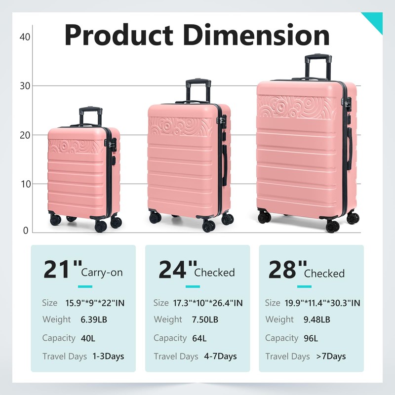 - [24 Inch Check in Luggage] The 24 inch suitcase increases your packing capacity and is more suitable for your long trips.Size:17.3"*10"*26.4"IN. Capacity: 64L.