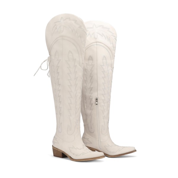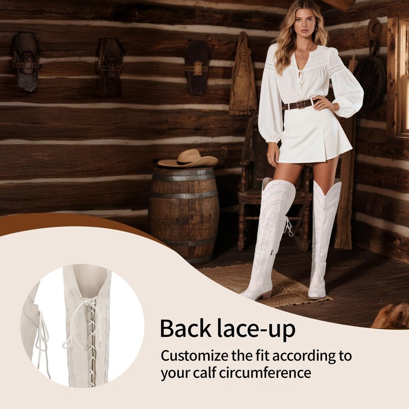Krypthixor White Thigh High Cowboy Boots With Lace Up Over The Knee Cowgirl Boot For Women Embroidered Western Boot With Side Zipper Comfortable Wide Calf Tall Boots Size 9