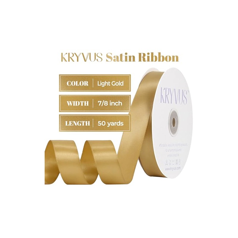 Kryvus Light Gold Satin Ribbon, Double Faced 7/8 Inch X 50 Yards Light Gold Ribbon, Premium Satin Ribbon for Gift Wrapping, Crafts, Hair Bow Making, Sewing, Flower Bouquet, Wedding Party Decor