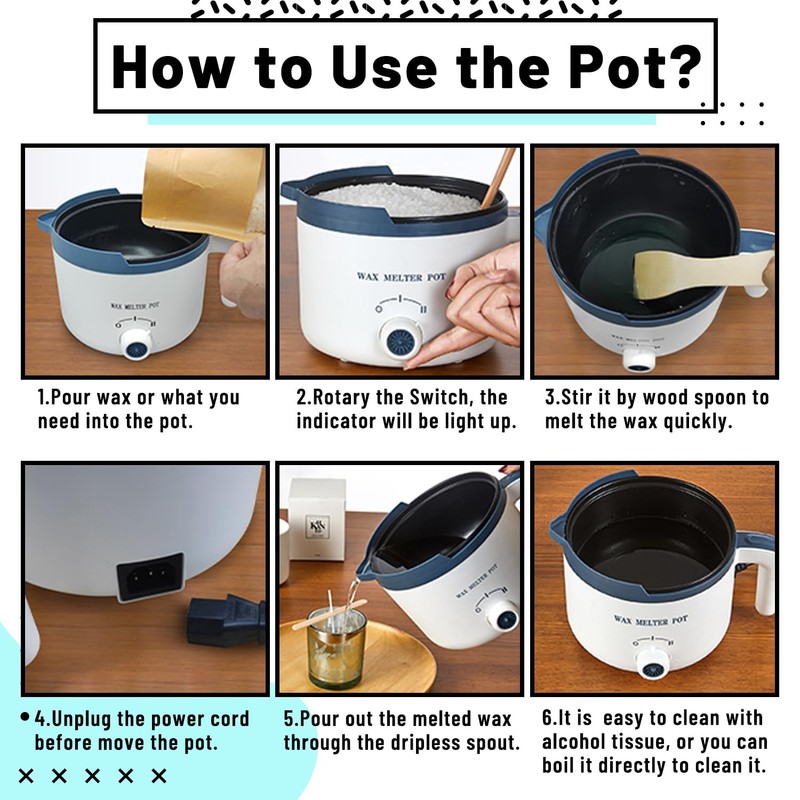 • {Easily Cleaning}: Our wax melting pot is desiged with non-stick for the inner of the pot, which is easy to clean by acohol wipes or directly boile water, no residues after use. Package included: 1 x candle candle wax melter , 1 x US plug, 1x wooden spoon, 1 x manual.