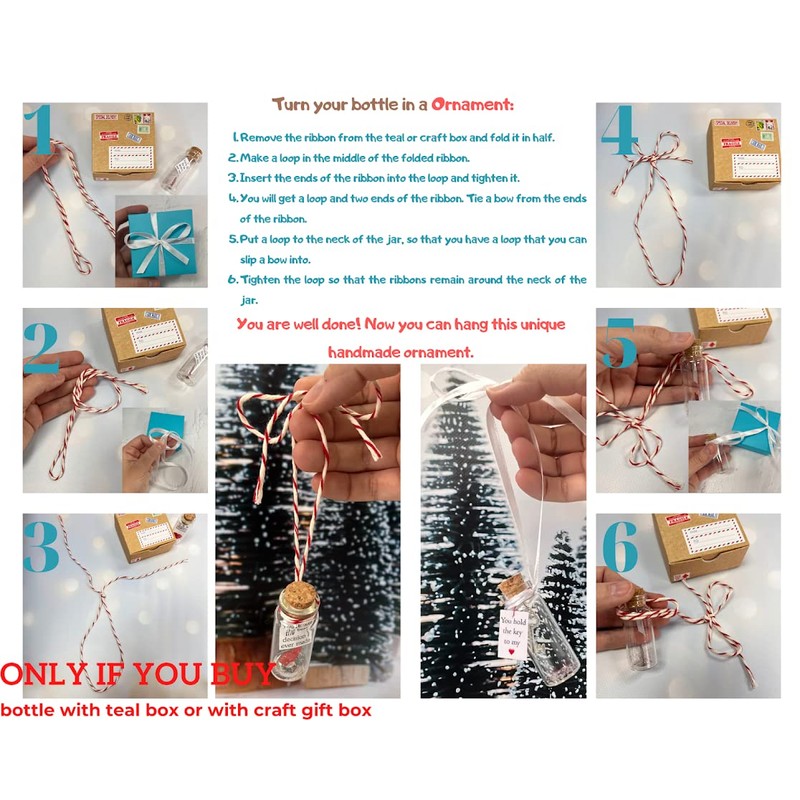 A veces dudamos si decirles a nuestros seres queridos lo que pensamos, o simplemente no sabemos cómo expresar nuestros sentimientos. Elije nuestro frasco de cristal exclusivo con una llave colgada en su interior. “Tienes la llave de mi corazón" es un mensaje impreso en la tarjeta adjuntada. Creemos que es una manera perfecta de no decir simplemente "Te quiero", sino de mostrarlo con este lindo regalo hecho a mano. ¿Se acerca un aniversario? ¿O el Día de San Valentín? ¿Te gustaría sorprender a tu ser querido con una cosa tipo carta de amor? ¿Y qué te parece hacer un regalo de Navidad realmente bonito a él o a ella? Algo diferente a todos estos collares, pulseras, marcos, almohadas, mantas, tazas y carteles. Que sea una obra de arte maravillosa y significativa hecha a mano. ¡Esta hermosa botella de los deseos con una llave pequeñita es lo que necesitas! Es una forma especial de decir "Tengo sentimientos por ti". ¡Porque literalmente estás entregando la llave de tu corazón! Además, tienes la opción de elegir cómo se empaquetará esta increíble cosa: Botella con una tarjeta en un embalaje seguro. Puedes simplemente colocar esta pieza decorativa en un lugar fácil de encontrarla. En una caja de regalo de color azul turquesa con una cinta blanca. La caja se ve realmente bonita y no es necesario buscar un paquete de regalo adicional.