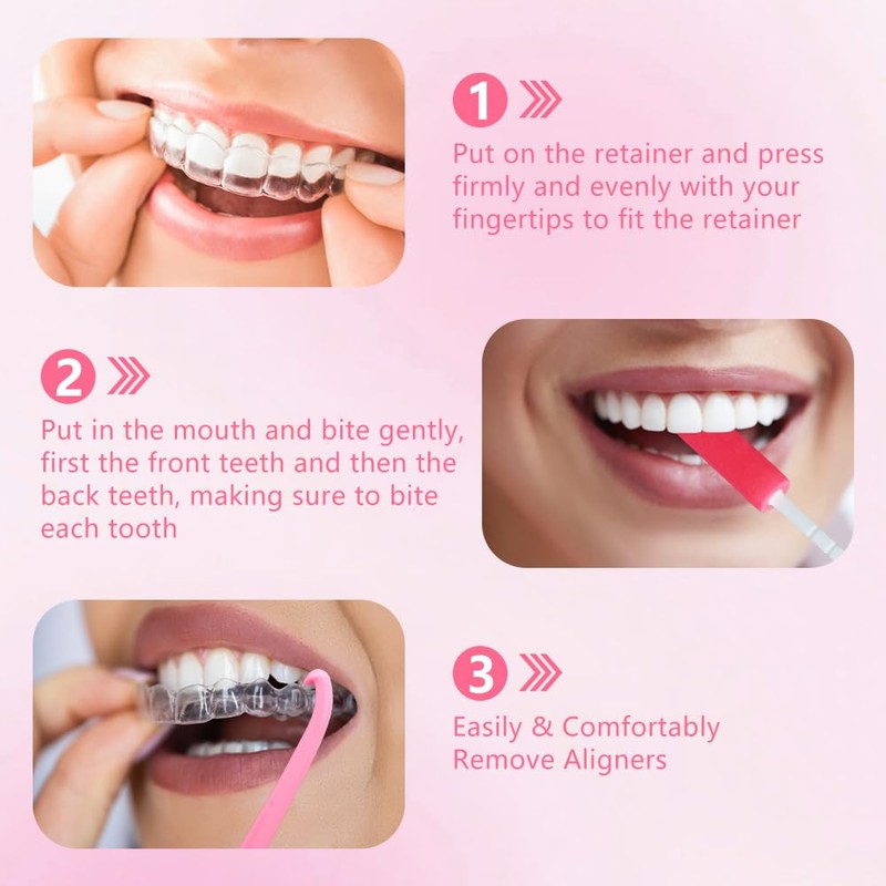 - 【Aligner Remover Tool】With frequent retainer changes, you may need a tool to remove them without damaging your teeth.We give away a retainer removal tool that you can easily remove your aligners.Simply insert your finger in the grip loop,position the hook end of the tool between the aligner and your molar, then gently pull down with light force.