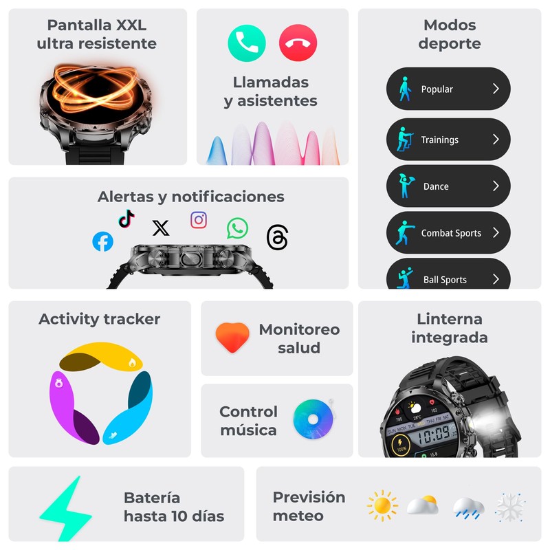 Experience new adventures with your KSIX Venture smartwatch. Make and receive calls through the microphone and internal speaker. Watch notifications from your favorite apps on the screen on the large 1.85" TFT screen. Monitor your health 24 hours a day during your trip or training. Planning a multi-day route? Don't worry, with up to 10 days of battery life, you can be quiet during the adventure. Nothing stops you!