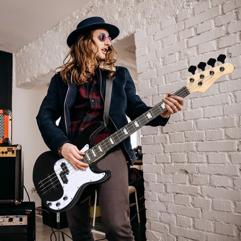 - STABLE QUALITY: The full-size bass guitar features a naturally dried solid paulownia body, maple neck, and rosewood fingerboard. Quality tonewood interstitial structure is uniform and dense, which is not easy to crack and deform. This right-handed bass guitar with a polished surface looks shinier while standing up to years of wear and tear