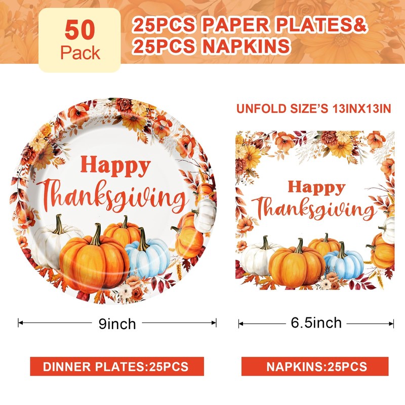- COMPLETE SET: 50-piece Thanksgiving party set includes 25 dinner plates (9 inches) and 25 matching napkins (6.5 inches) featuring festive fall pumpkin designs