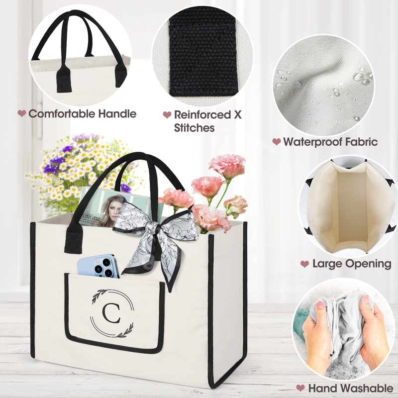 KTMOUW Initial Canvas Tote Bag Monogram Tote Bag for Women Large Beach Bag Personalized Gifts Bag for Birthday Bridal Shower Holiday Reusable Grocery Bags with External Pocket Letter C
