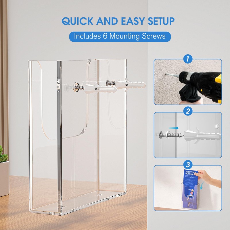 - Premium Acrylic Material: Our wall mount brochure holder is made from high-quality acrylic, ensuring exceptional durability, clarity, a sleek professional appearance, and resistance to yellowing over time.