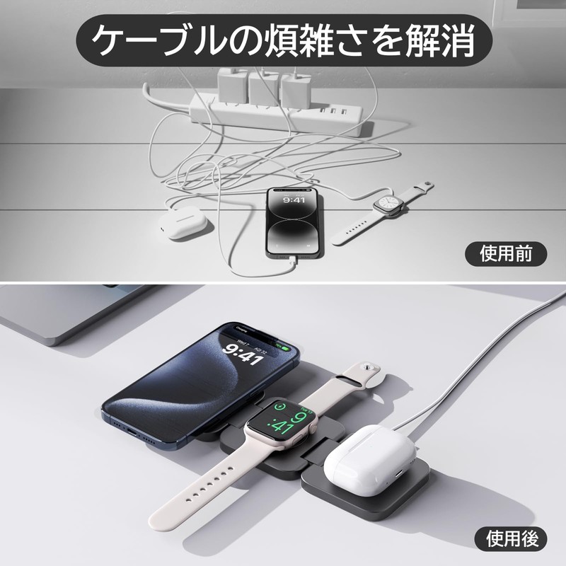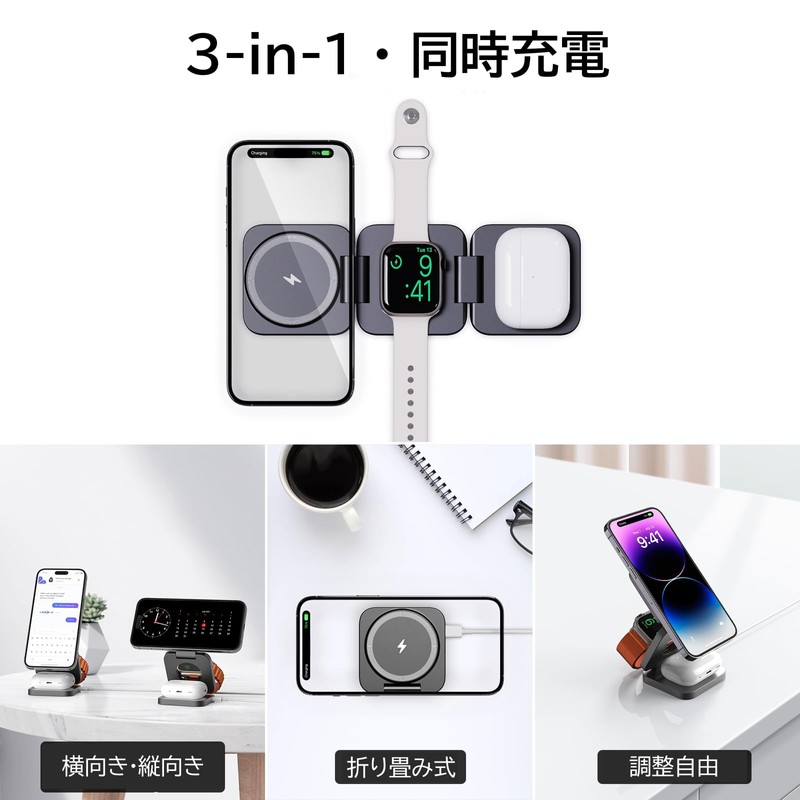 Wireless Charger 3 in 1 is a 3-in-1 charger for iPhone 15/14/13/12 series, AirPods with Mag-Safe Charging Case, Apple Watch All Series. Magnetic adsorption function makes it easy to install and start charging, free from the hassle of cables. The charging speed is 15W, 5W, and 5W, and the 20W USB-C charging adapter is designed for quick charging. In addition, it has protection against overcharging, overheating, foreign object detection, overcurrent prevention, and short-circuit protection to ensure safety. You can also freely adjust the vertical and horizontal viewing position, so you can watch videos or live streaming while charging. Package includes KUXIU X50 wireless charger, 20W USB-C charging adapter, Type-C cable, and Japanese instruction manual. Start your smart charging life with style and function with this 3 in 1 wireless charger.