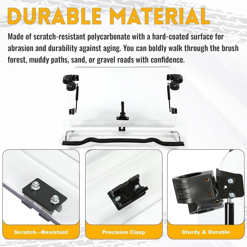 - Guard against-scratch Material: Crafted from high-strength, guard against-scratch materials, it is built to endure rough off-road environments. Whether it’s tree branches, rocks, or other obstacles, this windshield ensures your windshield stays intact and free of scratches