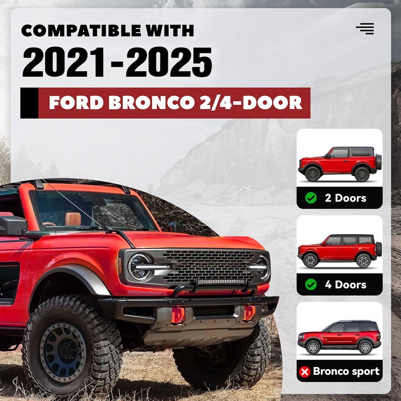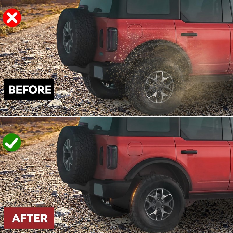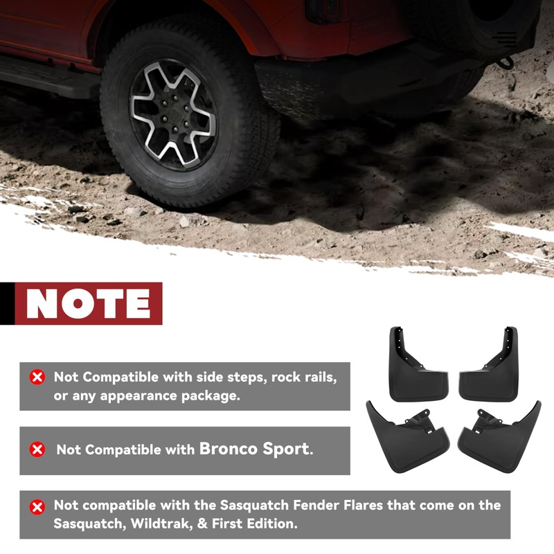 - Product Compatibility: Front & Rear Splash Shield Compatible with 2021-2025 Ford Bronco (Not compatible with side steps, rock rails, or any appearance package). Not compatible with Bronco Sport. Not compatible with the Sasquatch Fender Flares that come on the Sasquatch, Wildtrak, & First Edition.