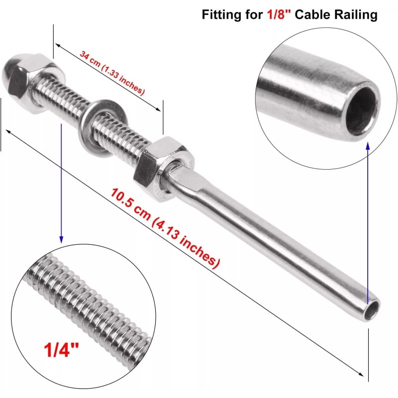 Applications: Ideal for creating your own cable railing project, these components are essential for anchoring cables at one end, with a tensioner needed at the opposite end. Suitable for both indoor and outdoor settings, they can be used with wood, steel, or aluminum posts on deck railings.
