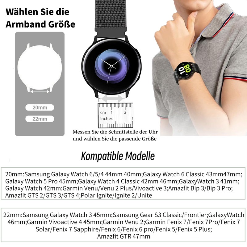 - Compatible Models - The nylon strap is compatible with almost all watches with 22 mm lugs, such as compatible with Samsung Galaxy Watch 3 45 mm / Galaxy Watch 46 mm / Gear S3 Frontier / Classic; Huawei Watch 3/3 Pro/GT3/GT2/GT2 Pro; Garmin Vivomove; Fossil Gen 5 / Fossil Men's Gen 4 / Fossil Women Gen 4 and other watches with Standard hub width of 22 mm.