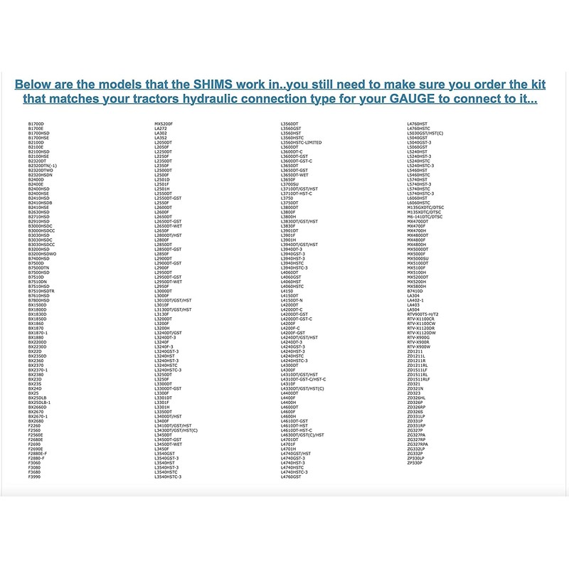 - NOTE: The included instructions are a general GUIDE (since many Kubota machines use the same hydraulic pump, we do not cover every Kubota model individually..smaller machines should follow the B/BX guide and larger machines should follow the L series guide... just follow your hydraulic lines to your pump, follow the instructions and apply the shims as needed!