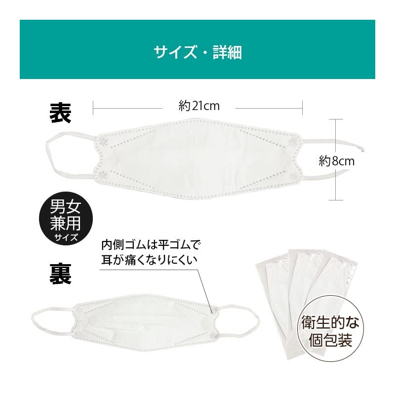 - 【耳ゴム】やわらかく、伸縮性の高い平ゴムを採用。長時間の着用時でも耳が痛くなりにくい。