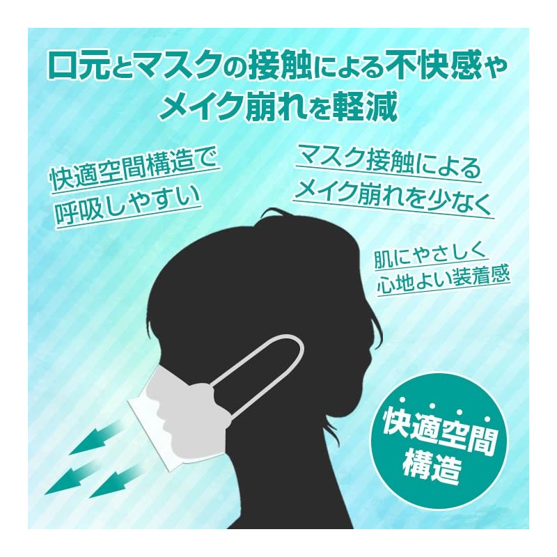 - 快適空間構造で口元とマスクの接触による不快感やメイク崩れを軽減します。