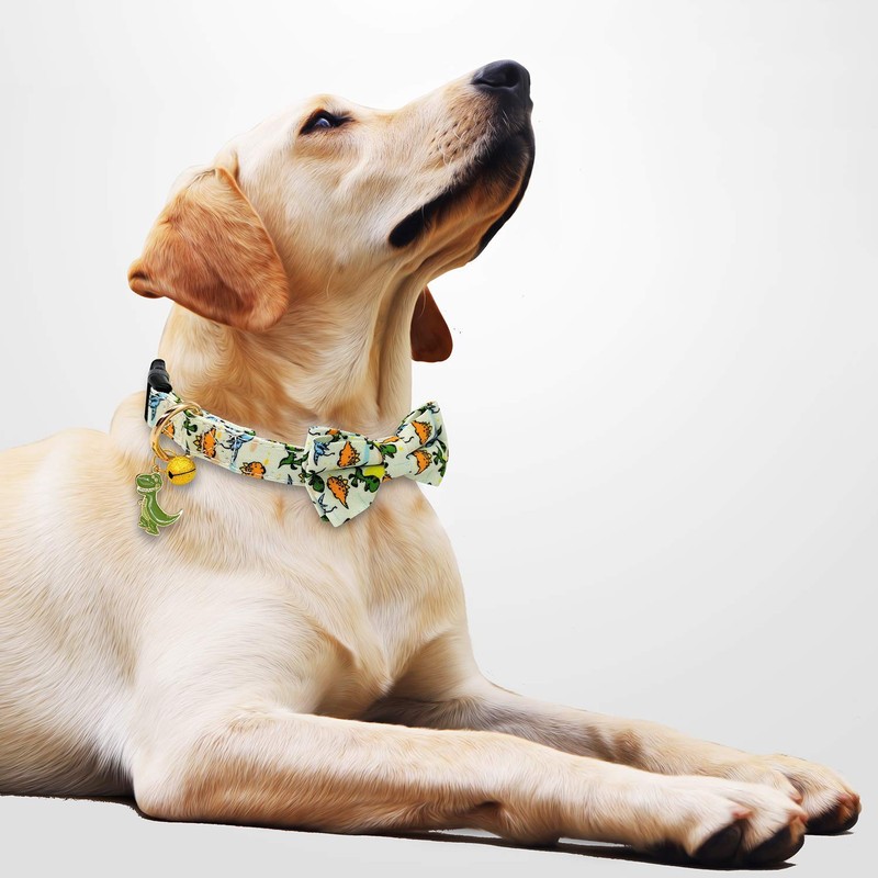 KUDES Dog Bow Tie, Adjustable Dog Collars with Bow Tie and Bells Charm Safety Buckle Cute Pet Collars for Small/Medium/Large Dogs and Cats Boys Girls (Dinosaur, S(10"-14"))