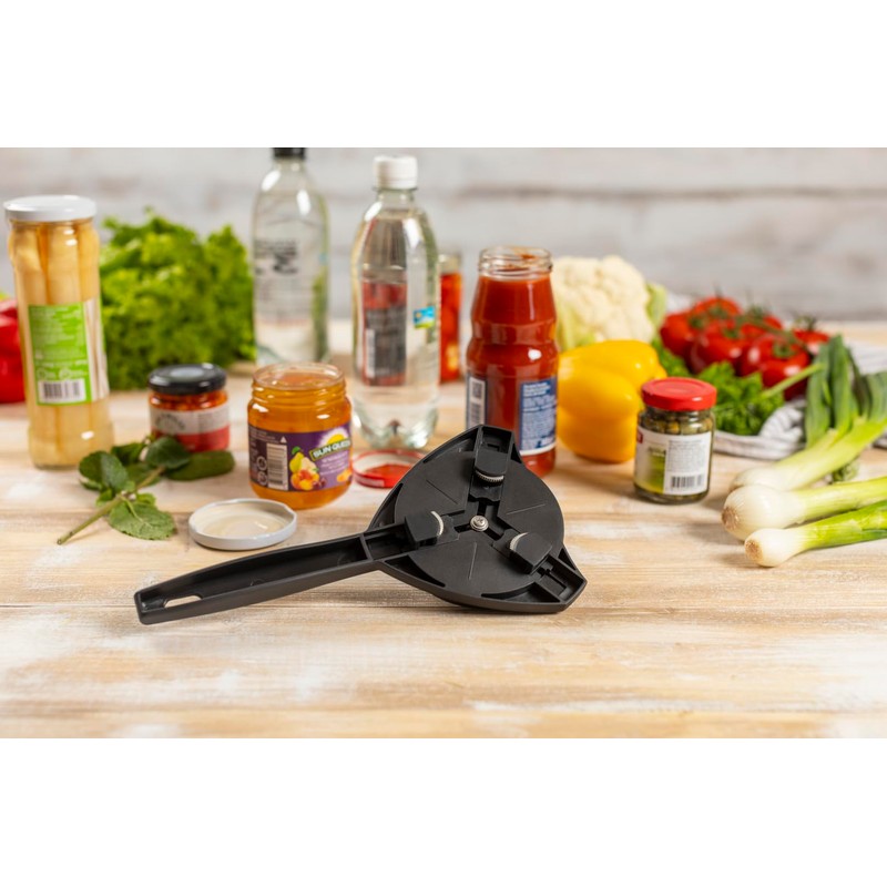 - JAR OPENER MAKES OPENING TRICKY LIDS EASY – three steel grippers securely lock on to metal or plastic jar lids, bottle tops and screw caps, so you can open and reopen jam jars, pickle jars, or cooking oil caps safely and without straining your wrist