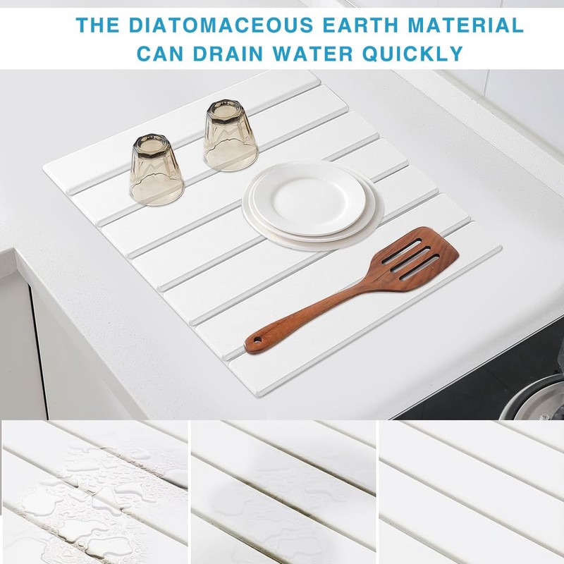 - FOLDABLE DESIGN: Diatom drying mat size: 15.75*11.81 in, with foldable design, space-saving, easy to store in drawers or cabinets, it is a great space-saving solution for home.