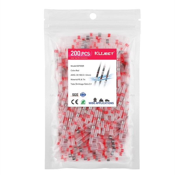 Kuject Kuject 200PCS Solder Seal Wire Connectors AWG 22-18, Red Solder Seal Heat Shrink Butt Connectors Terminals Solder Sleeve Waterproof Wire Splice Connector for Marine Automotive Boat Wire Joint