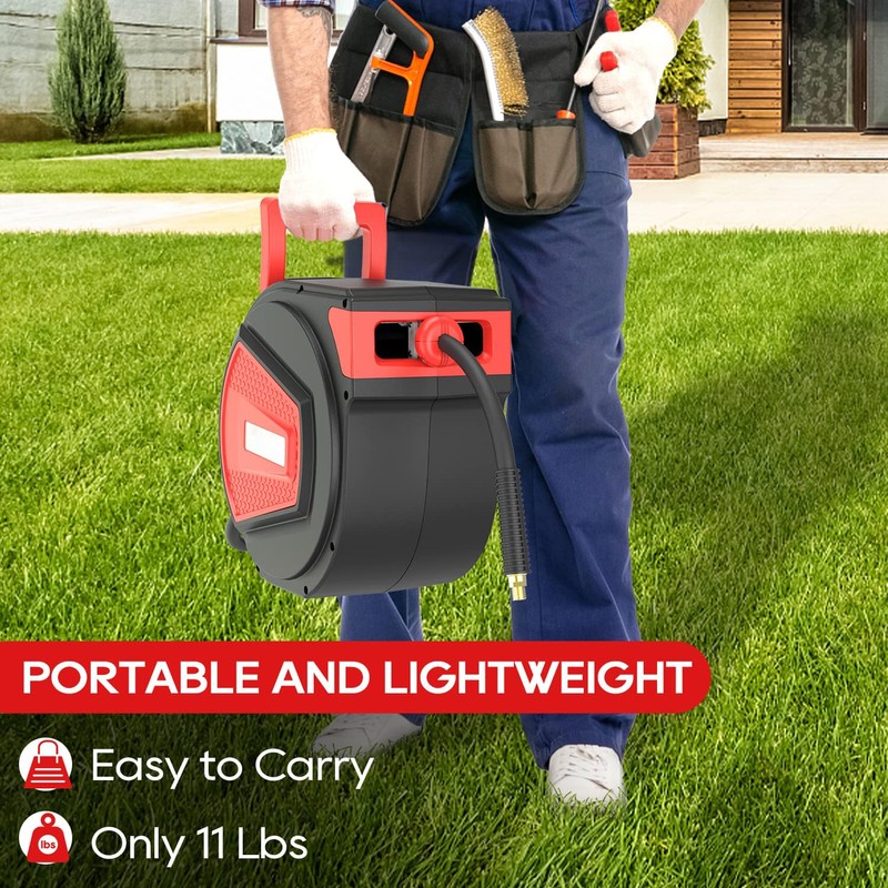 - Any-Length Lock Mechanism: With its any-length lock, this air hose reel allows you to pull the hose to the exact length you need and locks it in place. Ideal for precise jobs in garages, workshops, and construction sites.