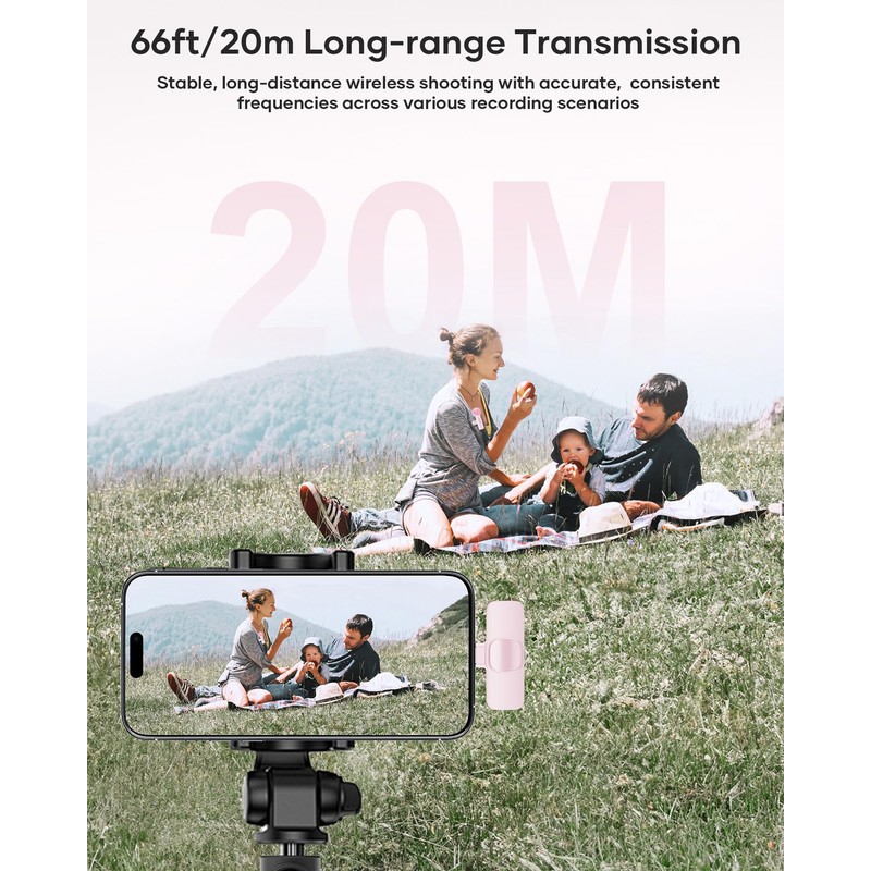 - PORTABLE WIRELESS MICROPHONE With its compact and portable design, this mini microphone can be held in your hand or attached to clothes. The iPhone-specific microphone provides stable transmission within a range of 20 meters in unhindered environments. It is ideal for influential content creators, TikToker and YouTubers, ensuring clear footage or video recording over long distances both indoors and outdoors.