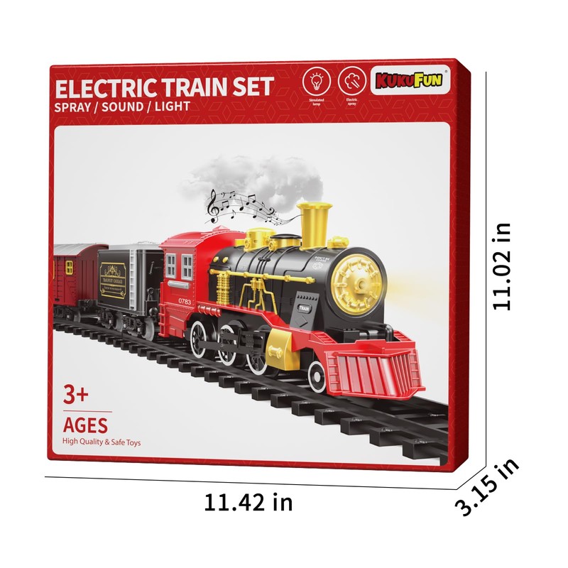 - 【Like A Real Classic Train Set】 When the train set runs, the train set will make the train sound. The locomotive of the train set has working headlights and realistic spray looks like the real classic train set. Kids can put the train set on their own designed train track, install the rechargeable battery, and start to play the train set. Also can set up decorative cards that revolve around the train track which will make the train game more exciting and fun.