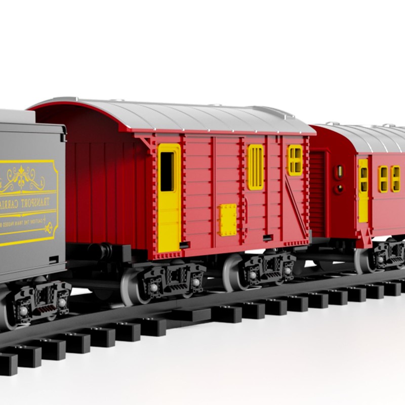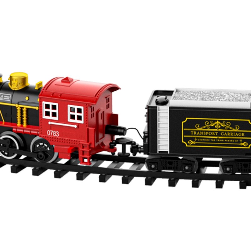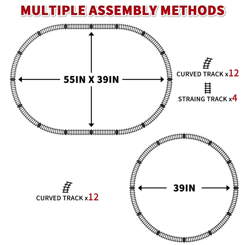 - 【Classic Christmas Train Set for Kids】 The train sets for boys come with a steam locomotive engine, a coal car, a cargo vehicle, a passenger coach, 12 curved tracks, 4 straight tracks and 8 exquisite cards. 16 pcs train tracks can be used to assemble round or oval tracks to meet the layout of different Christmas scenes. Kids can use cards to decorate the train set and make the train go through different scenery. Elliptical track dimension is 55"x 39". The length of the train is 27.9".
