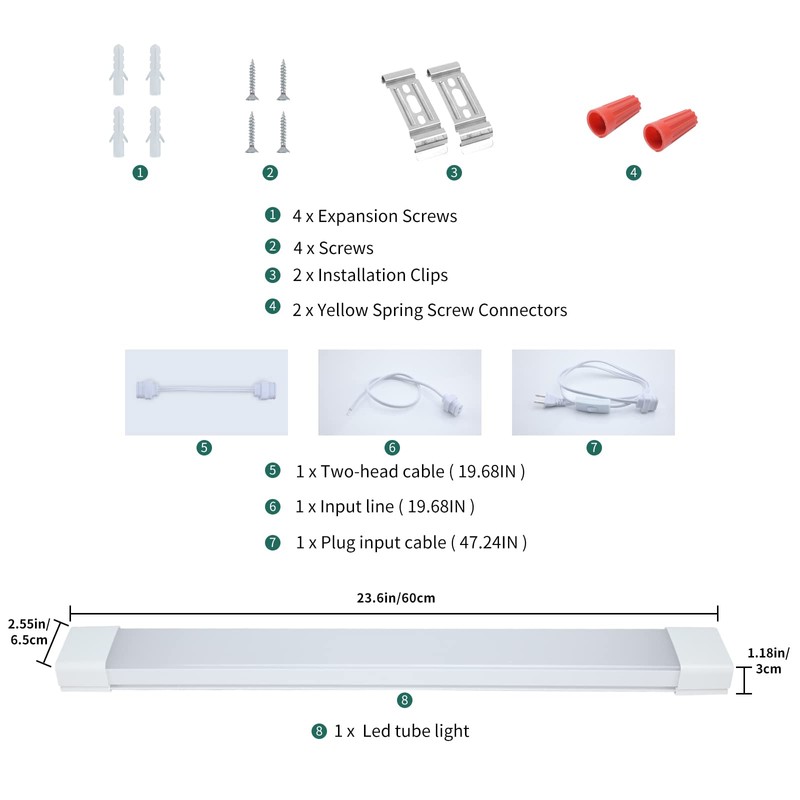 • 【LINKABLE AND NO FLICKER】This led tube light could connect up to 18 tube lights together with 19.6 inches connector cords. comfortable led shop light fixture. With 180° wide-angle beam, This led ceiling and closet light is no flickering.