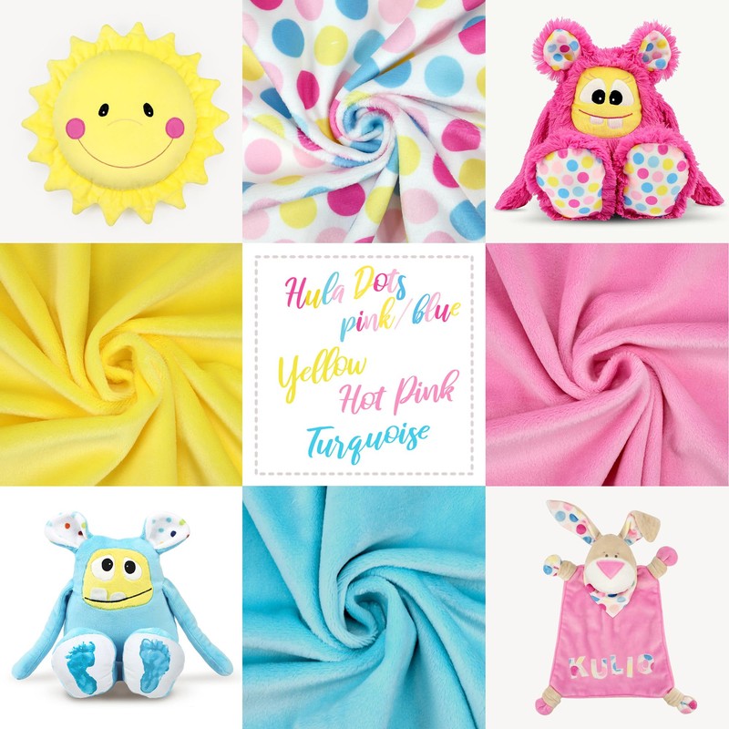 - High-quality plush material: Bundle of 5 pre-cut, slightly stretchy minky fabric pieces made from 100% polyester microfiber, with a size of 19.5x29.5 inch (50x75 cm) each, in the colors YELLOW, TURQUOISE, HOT PINK & our minky print HULA DOTS PINK-BLUE. Our fuzzy, durable & easy-to-sew plush fabric retains its comfort, softness and vibrant color even after multiple washes, ensuring long-lasting quality.