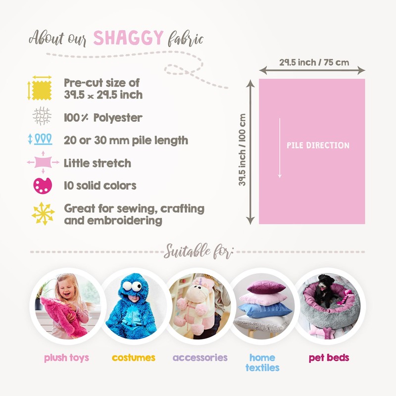 Please note that there are two different pile lengths available: 1 3/16 inch (30 mm) and 3/4 inch (20 mm). The colours BROWN and TURQUOISE are the only ones with 1 3/16 inch (30 mm) long piles, all of the other colours are 3/4 inch (20 mm). What's great: you can also combine our long-piled plush SHAGGY with our short-piled plush SHORTY! The colours of both plush types are coordinated with each other. So check our shop for colour matching short pile plush fabrics!