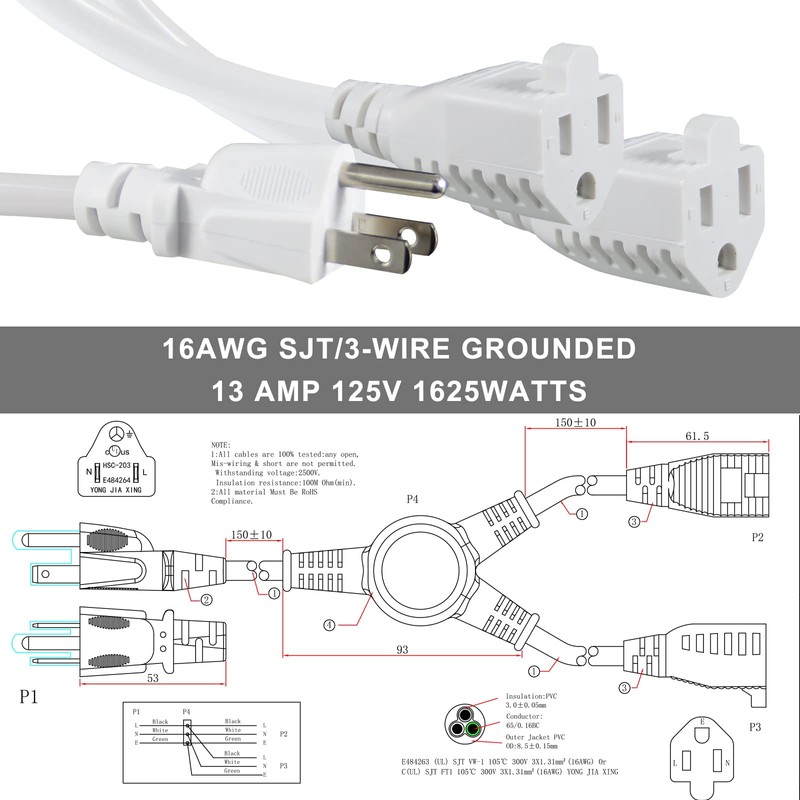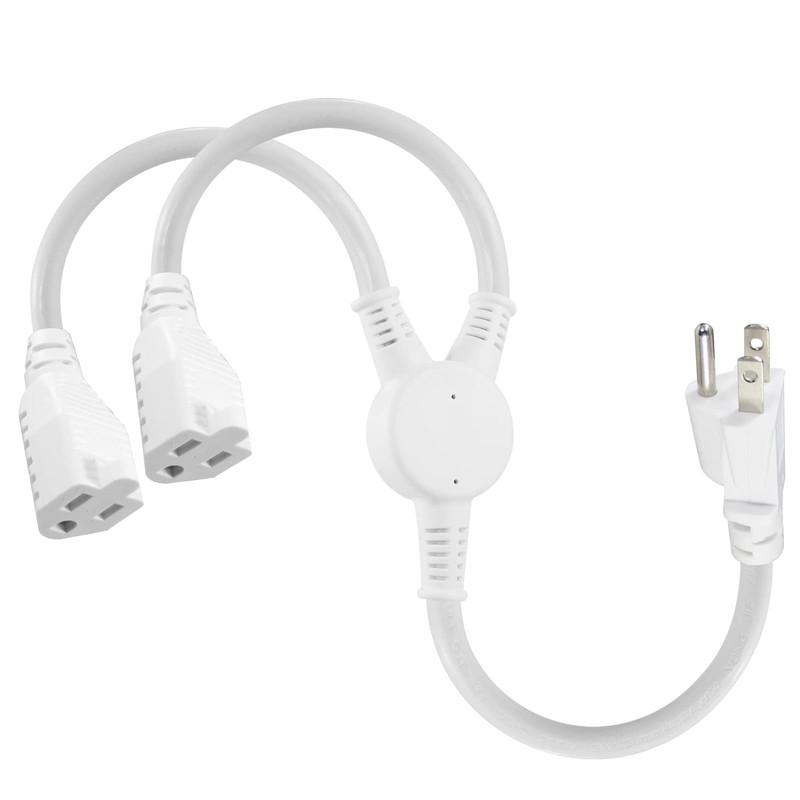 - 【Y Splitter Extension Cord】Heavy Duty 3 Prong Power Splitter Extension Cord, Connectors: 1 x NEMA 5-15P to 2 x NEMA 5-15R; Cable Type: SJT; Wire Gauge: 16 AWG; 125V 13AMP; Color: White; Length 1 Feet.