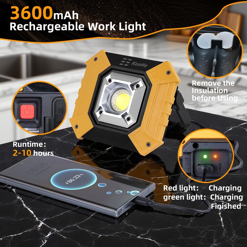 - Wide Application:This rechargeable LED work light is suitable for camping, fishing, hiking, barbecue, car repair, garage lighting, workshop lighting and more indoor/outdoor activities. Whether indoors or outdoors, it can provide a comfortable and bright lighting environment; in industrial places such as factories and warehouses, it can also illuminate every corner and improve work precision.