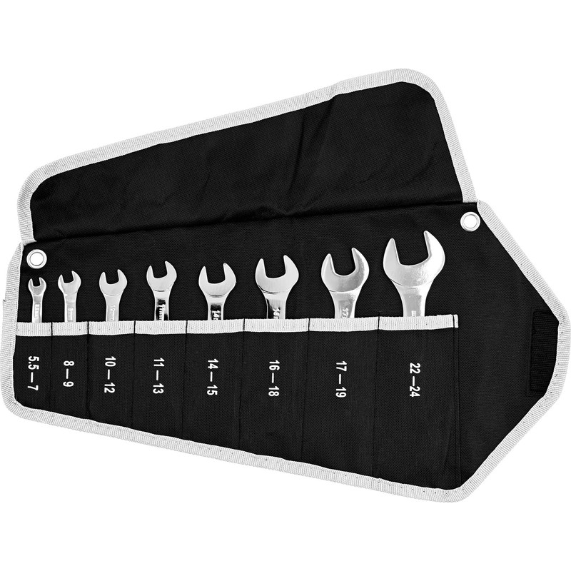 • Box contents: the set consists of eight tools with key sizes 5.5 x 7, 8 x 9, 10 x 12, 11 x 13, 14 x 15, 16 x 18, 17 x 19 and 22 x 24 mm, including black fabric storage bag with lacing