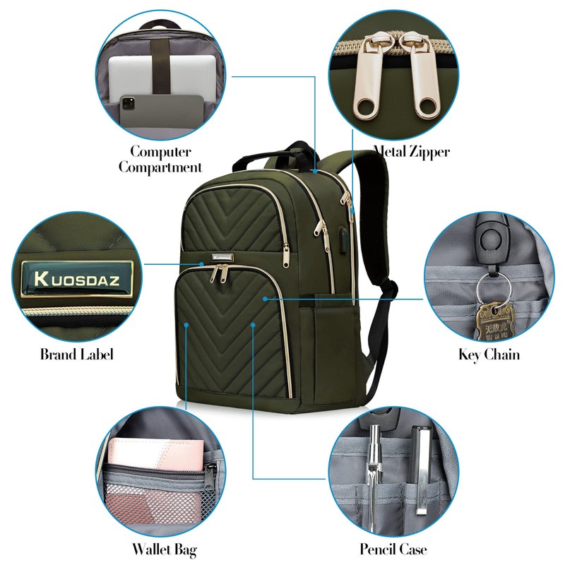 • Mochila de gran capacidad con compartimento para portátil: el tamaño de la mochila para portátil Kuosdaz para mujer es: 17 x 12 x 7 pulgadas, 25 L. La mochila para portátil tiene un total de 4 compartimentos y 2 bolsillos laterales, 1 compartimento acolchado para portátil de 15.6 pulgadas. 1 compartimento principal interior para tus carpetas, libros, ropa, etc., así como otras necesidades diarias. 2 bolsillos delanteros para bolígrafos, anteojos de sol, cargador, llaves. Las mochilas de viaje para portátiles mantienen todo organizado.
