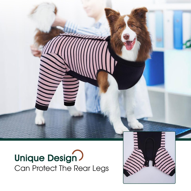 Our dog recovery suit design with adjustable hook and loop straps allow you to adjust the suit to fit your dog. The hind legs are protected with breathable polyester dog leg sleeves so that wounds can heal, but your dog can't lick or chew them.
