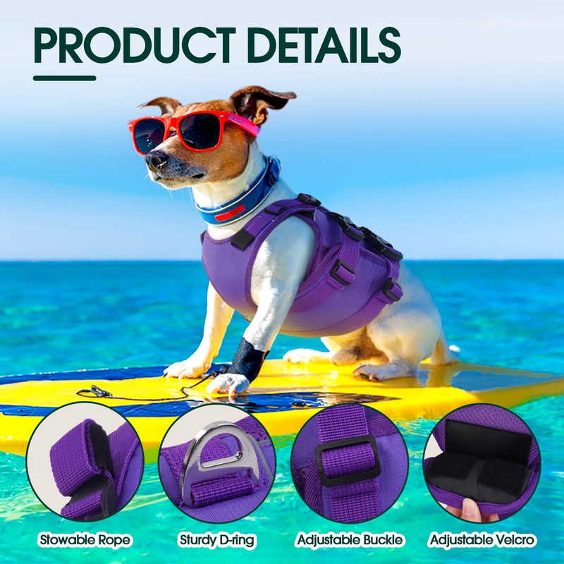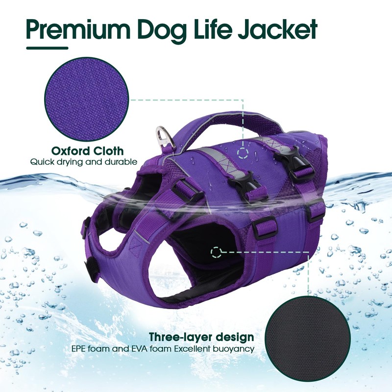 Kuoser Small Life Jacket for Dogs, Life Jacket with Handle and Reflective, Adjustable Dog Life Jacket, Life Jacket for Small Dogs with Improved Buoyancy, Purple, S