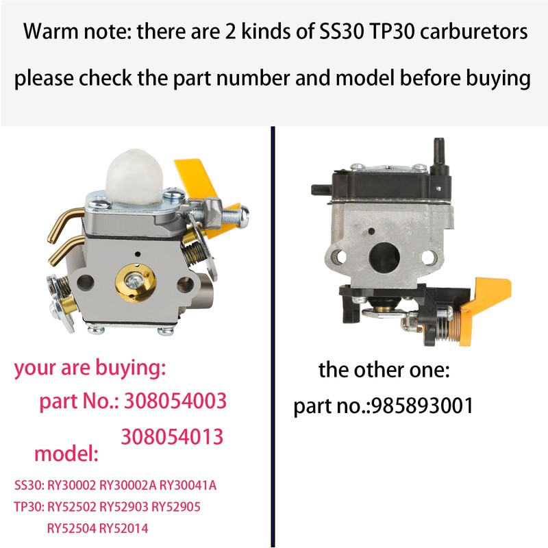 - Kurihina Compatible with Carburetor Fit for Ryobi Homelite CS26 SS30 SS26 SX135 EX26 BC26 BC30 TP30 25cc 26cc 30cc string trimmer brushcutter edger blower pruner; Warm note: there are 2 kinds of carburetors for SS30 TP30; THIS IS A SS30 TP30 CARBURETOR PART#308054003,308054013; if your carburetor part number is 985893001, this will not fit your machine.