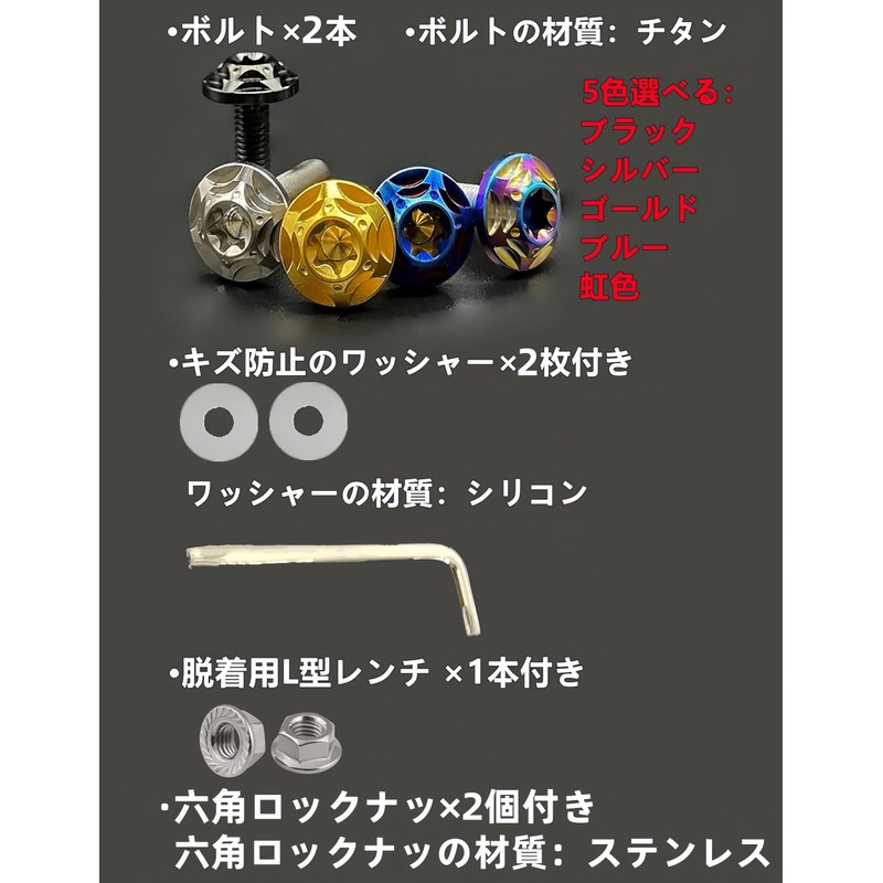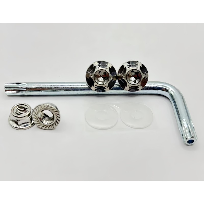- Material: Bolts (titanium), Washers (silicone), Hex Lock Nuts (stainless steel)