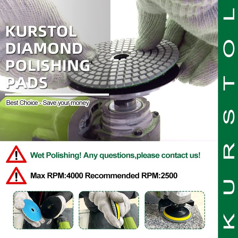 KURSTOL Dry Diamond Polishing Pads Set - 7pcs 100mm Countertop Polishing pads +1pc Backer Pad of Plastic Body+1pc Adapter M14 Thread to Round Shank for Granite Quartz Stone Marble