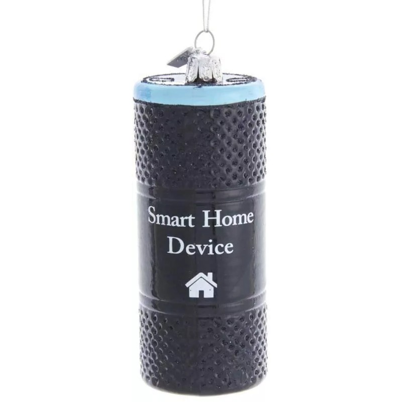 This Kurt Adler Noble Gems smart home device ornament is perfect for the techie in every family. It features a black, white and blue cylindrical design accented by black glitter. Part of Kurt Adler Noble Gems collection; perfect for any holiday decor. Made of glass and paint/mica; hangs from silver string. Item Size: 4.75 inches high