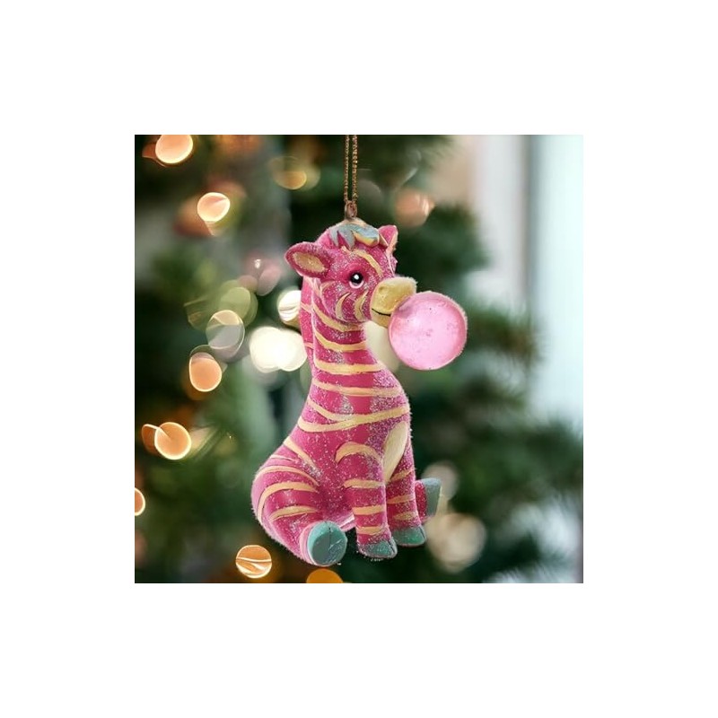 - Quirky Zebra Design: Pink stripes and a bubblegum bubble for a fun, unexpected twist on holiday decor.