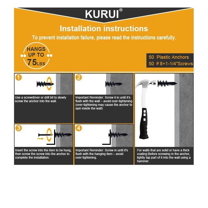 - PREMIUM NYLON MATERIALS PLUS GLASS FIBER C Made of high-quality hard nylon plastic mixed with highly robust glass fibers, these threaded self-tapping wall anchors are super hard, durable, anti-aging and wear resistant. They can hold objects with maximum weight of 75lbs and provide strong and sturdy grip into the wall, and the anchor will not damage the dry wall. 50 premium galvanized Phillips screws ensures reliable installation and hanging.